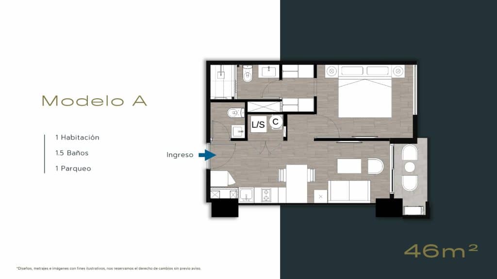 Estacionamiento: 1 parque en el modelo de 1 habitación y 2 parqueos en los modelos de 2 habitaciones (12.5 m²) por cada parqueo.